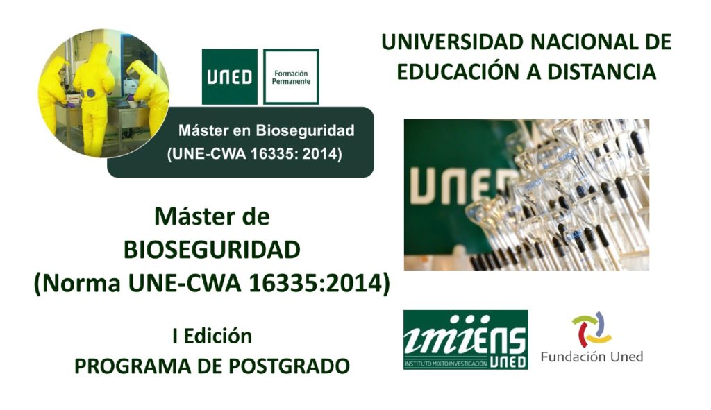 A través de la Universidad Nacional de Educación a Distancia (UNED), teniendo como uno de los directores del título a el miembro fundador y actual Vocal de AEBioS, Gonzalo Pascual, y a muchos reputados Socios Numerarios de nuestra Asociación entre el profesorado, este máster en Bioseguridad tiene como finalidad una formación en bioseguridad específica para alcanzar las competencias del profesional de bioseguridad según lanorma UNE-CWA16335:2014.